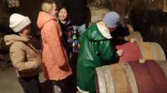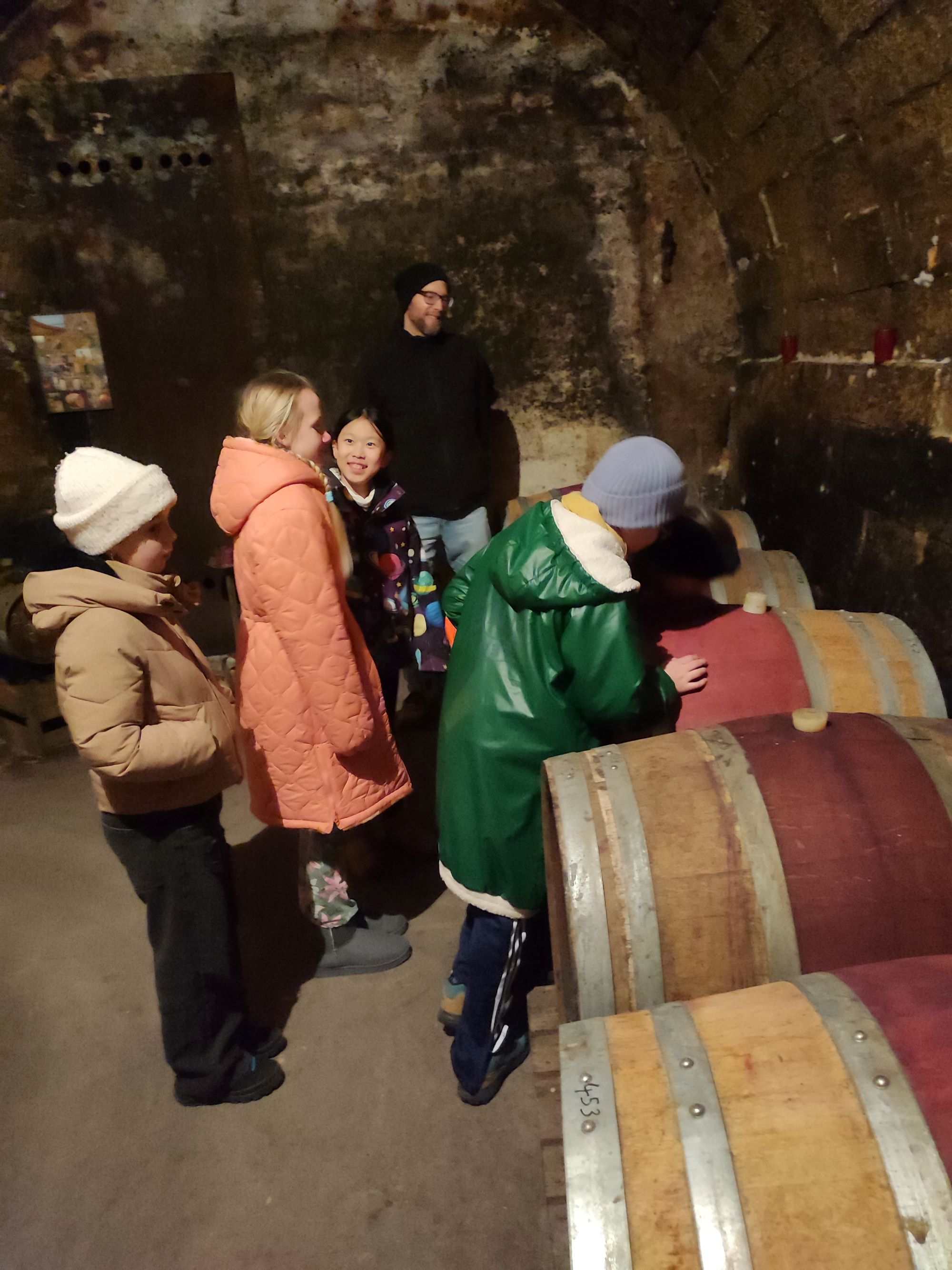 Auch dieses Mal war das Weingut Hirsch mit dabei, um uns einen Einblick in ihr Berufsbild zu geben. Zur Begrüßung bekamen wir eine kleine Kostprobe vom hauseigenen Traubensaft. Herr Hirsch betreibt in dritter Generation das Weingut und beantwortete gern unsere Fragen. Unter anderem produziert das Weingut aus ca. 45 Hektar Rebfläche: Wein, Sekt und Traubensaft. Aus einem Hektar werden bis zu 10.000 Flaschen hergestellt. Sogar nach Japan, Norwegen und der Schweiz werden die Produkte verschickt. Auch der Deutsche Fußballbund (DFB) wird beliefert, um bei Heimspielen der Nationalmannschaften im VIP-Bereich ausgeschenkt zu werden. Bei einem kleinen Rundgang durch den Betrieb erklärte Herr Hirsch wie die Trauben angeliefert werden, der Zuckergehalt (Öchsle) gemessen wird und die Trauben (je nach Sorten) gepresst werden.