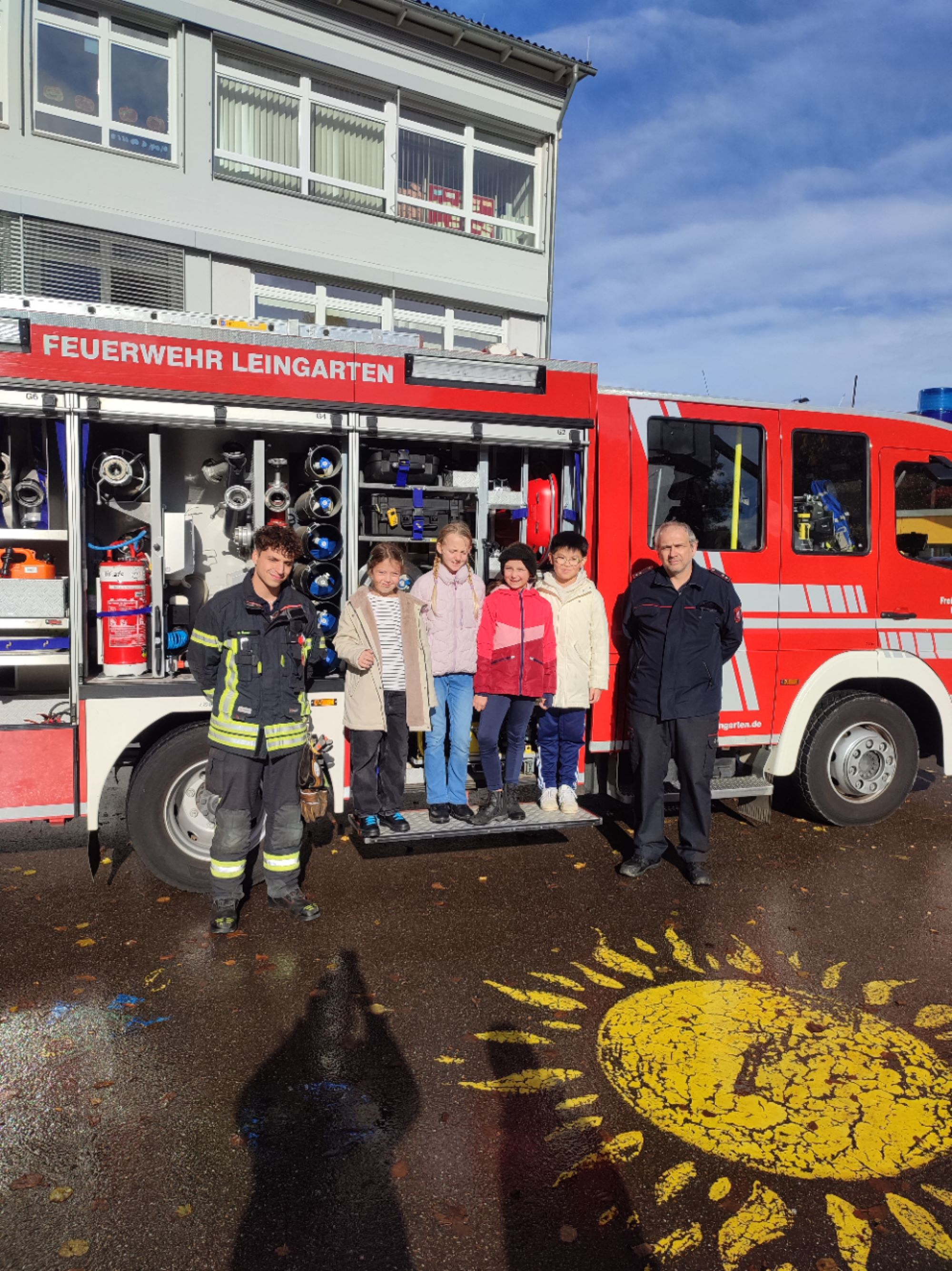 Den Beginn machte am 23.10.2025 die Freiwillige Feuerwehr Leingarten, welche auch schon beim letzten Mal dabei war. Herr Bauer und Herr Fritz kamen mit dem Hilfeleistungslöschgruppenfahrzeug (HLF) zu uns auf den Schulhof. Nach einer kurzen Begrüßung konnten wir gleich Fragen zur Einsatzkleidung stellen und erfahren, welche Nummer gewählt werden muss, wenn es brennt. Natürlich wussten das die Kinder bereits - 112. Uns wurde ebenfalls der Unterschied von Alltagskleidung und Einsatzkleidung erklärt und was ein Feuerwehrmann/-frau alles braucht, um einsatzbereit zu sein. Danach zeigten uns die beiden Feuerwehrmänner wie ein Atemschutzgerät funktioniert.