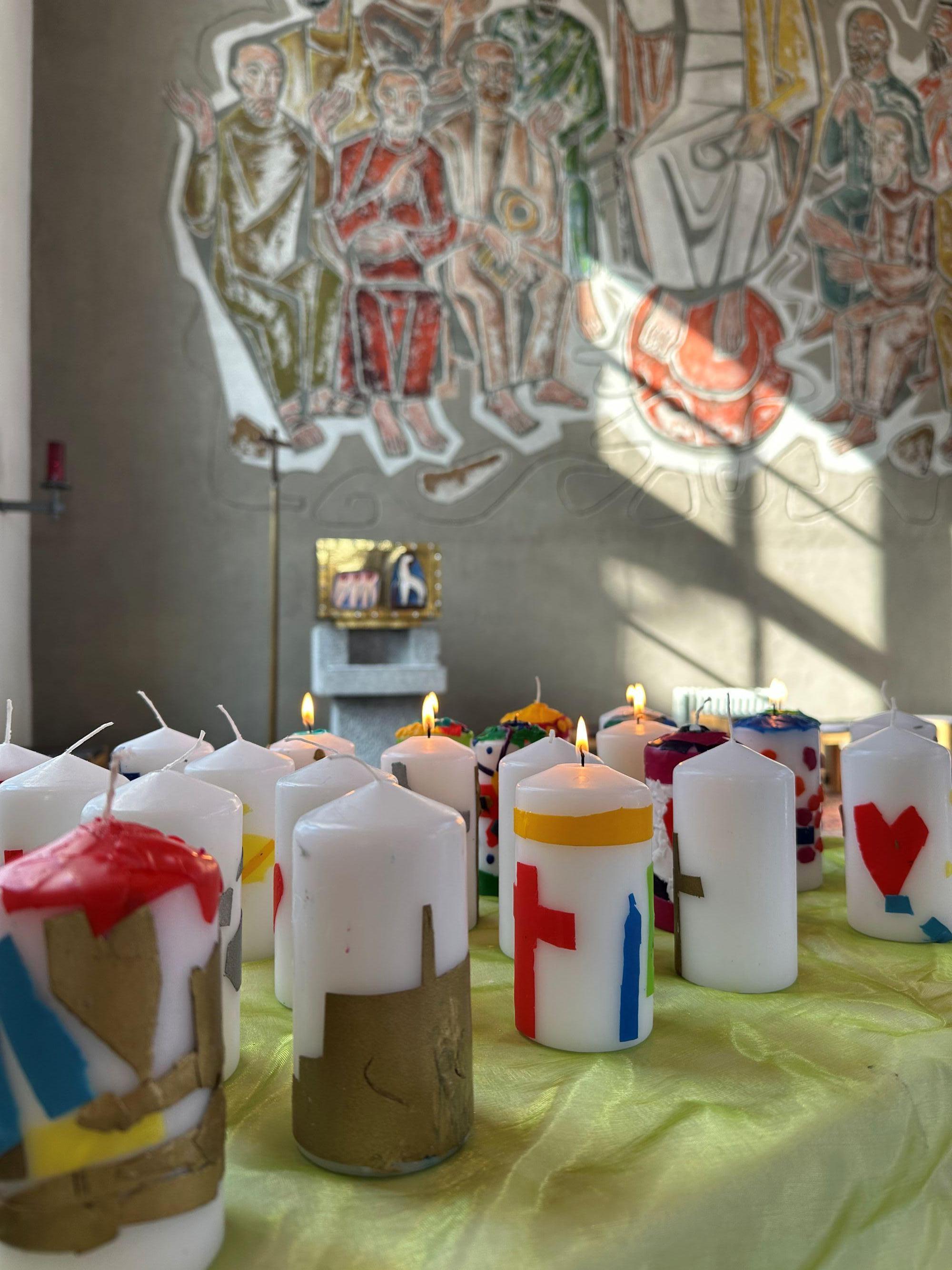 Als Erinnerung erhielten die Kinder eine persönliche Tauferinnerungsurkunde. Außerdem durften sie ihre im Religionsunterricht gestalteten Tauferinnerungskerzen, die während des Gottesdienstes hell leuchteten, mit nach Hause nehmen.