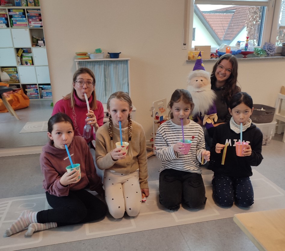 Am 04.12.25 besuchten wir die Praxis für Logopädie und Lerntherapie Isabelle Domann, welche auch schon beim letzten Mal dabei war. Nach einer kurzen Begrüßung konnten wir gleich Fragen an Frau Domann und Frau Dörr stellen. Wir erfuhren, dass ganz verschiedene Menschen die Hilfe eines Logopäden in Anspruch nehmen. Säuglinge, Kindergartenkinder, Schulkinder, junge Erwachsene, auch Omas und Opas wird geholfen. Spielerisch konnten wir vor einem Spiegel unsere Zungenfertigkeit beobachten. Bei einer anderen Übung bekam jedes Kind einen Becher mit Wasser und einen Trinkhalm. Wir erzeugten durch das Reinpusten Blubberblasen und damit verschiedene Töne. Frau Dörr las uns eine kleine Geschichte von einer Maus vor. Diese Maus ging über einen Spielplatz und hielt an verschiedenen Spielgeräten an.