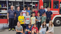 Anschließend wurde das Feuerwehrauto angeschaut. Die Kinder staunten nicht schlecht, was alles in ein Einsatzfahrzeug passt. Es durfte auch eine Einsatzjacke probiert werden. Schnell merkten die Kinder, wie schwer diese Jacke ist. Das besondere Highlight war mit einem Schlauch, der mit einem Strahlrohr bestückt war, selbst zu „löschen“.