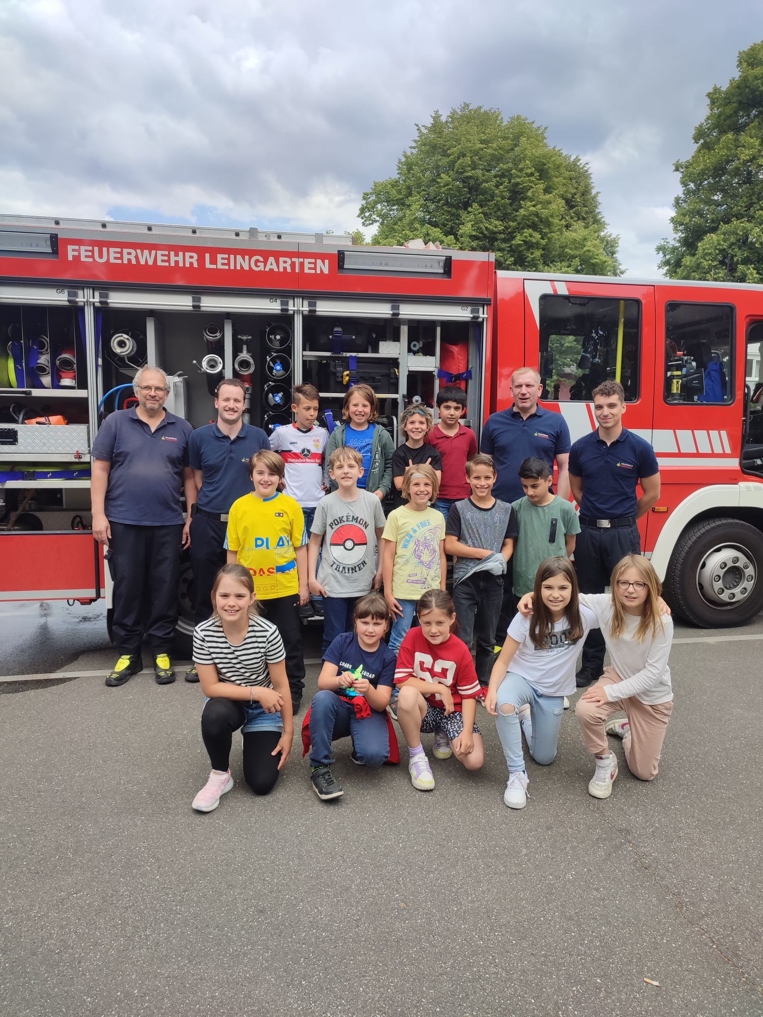 Letzte Woche bekamen einige Kinder der Hans-Sauter Schule, im Rahmen ihrer AG, Besuch von der Feuerwehr Leingarten. Aufgrund der begrenzten Zeit trafen wir uns auf dem Parkplatz der Festhalle. Mit spannenden Fragen und Vorfreude begrüßten die Kinder der 2. und 3. Klasse die Feuerwehrmänner. Diese beantworteten sehr genau und geduldig die Fragen, z. Bsp.: „Wie lange hält eine Atemschutzflasche im Einsatz?“, „Was geschieht, wenn die Drehleiter zu kurz ist?“