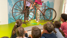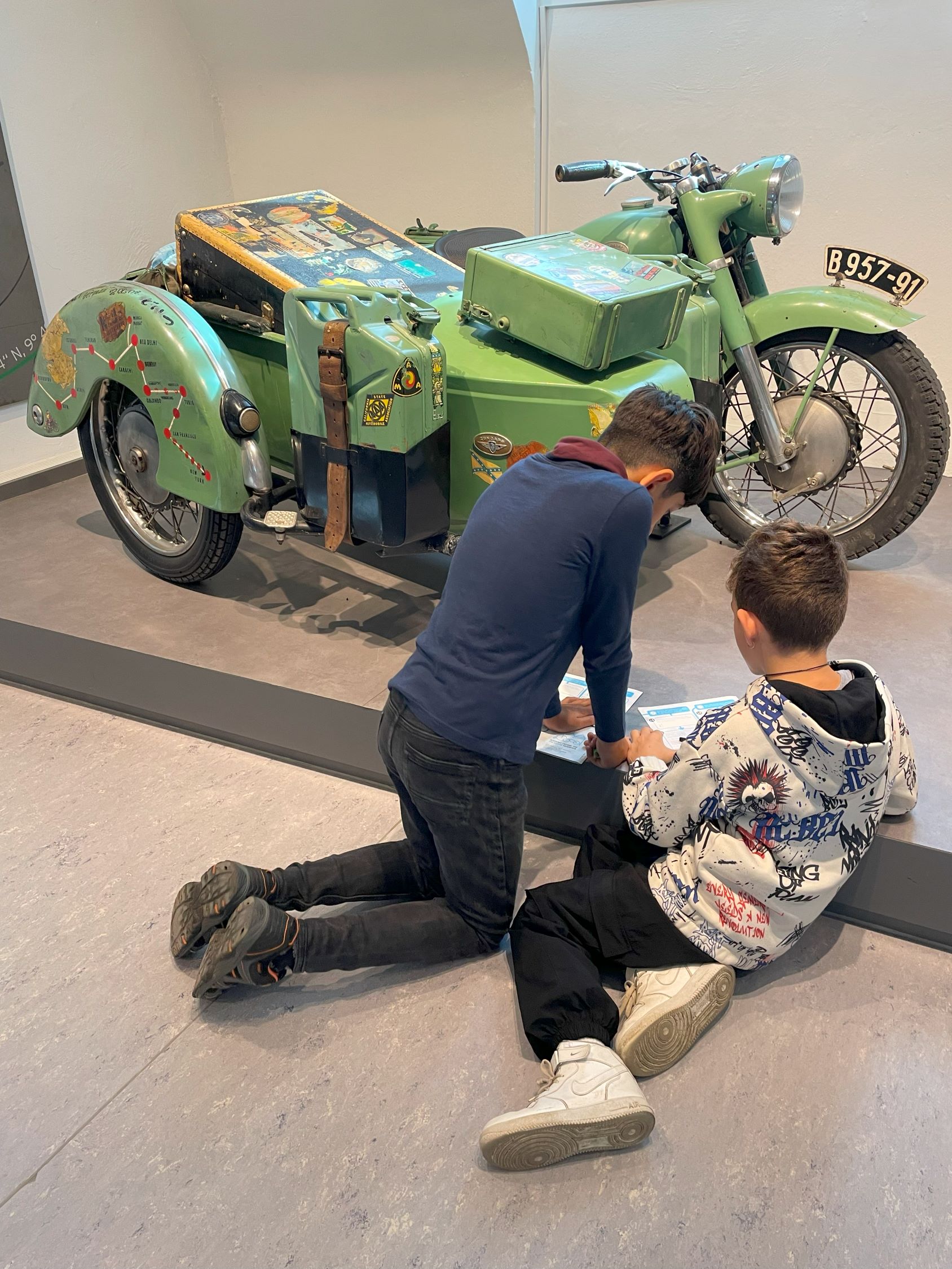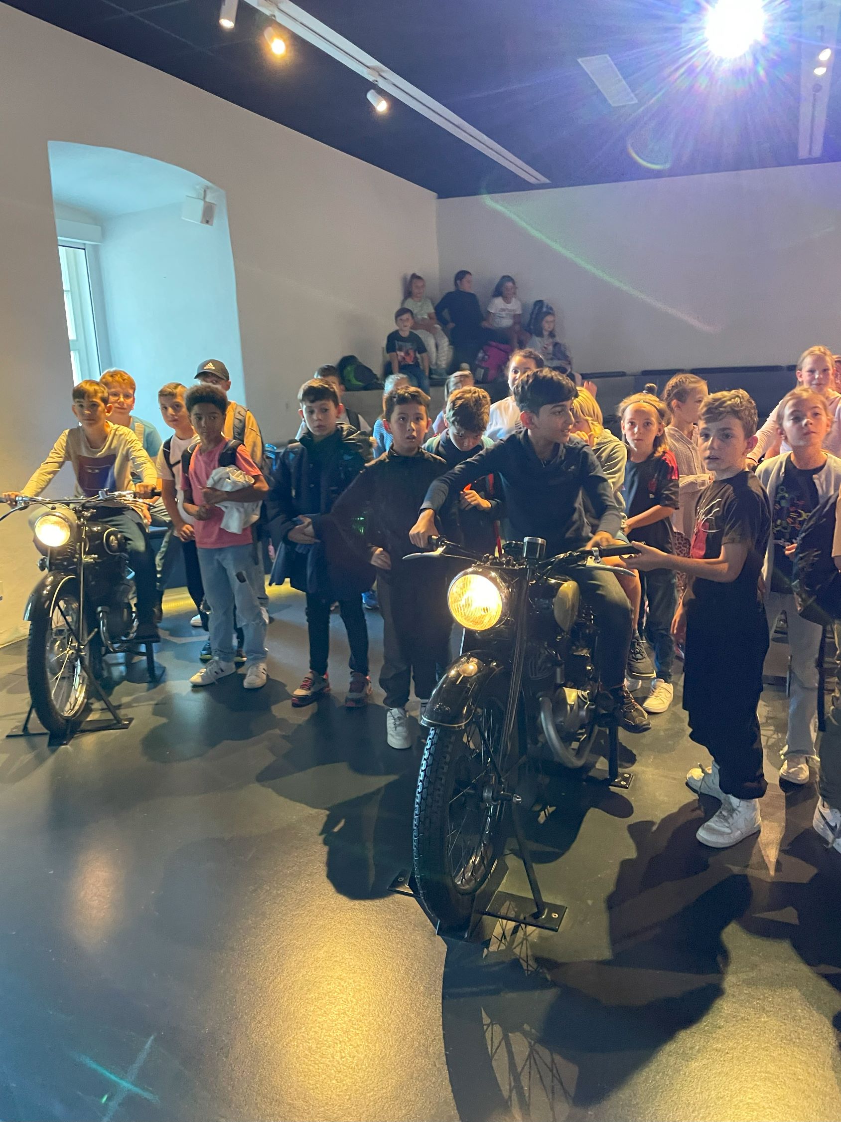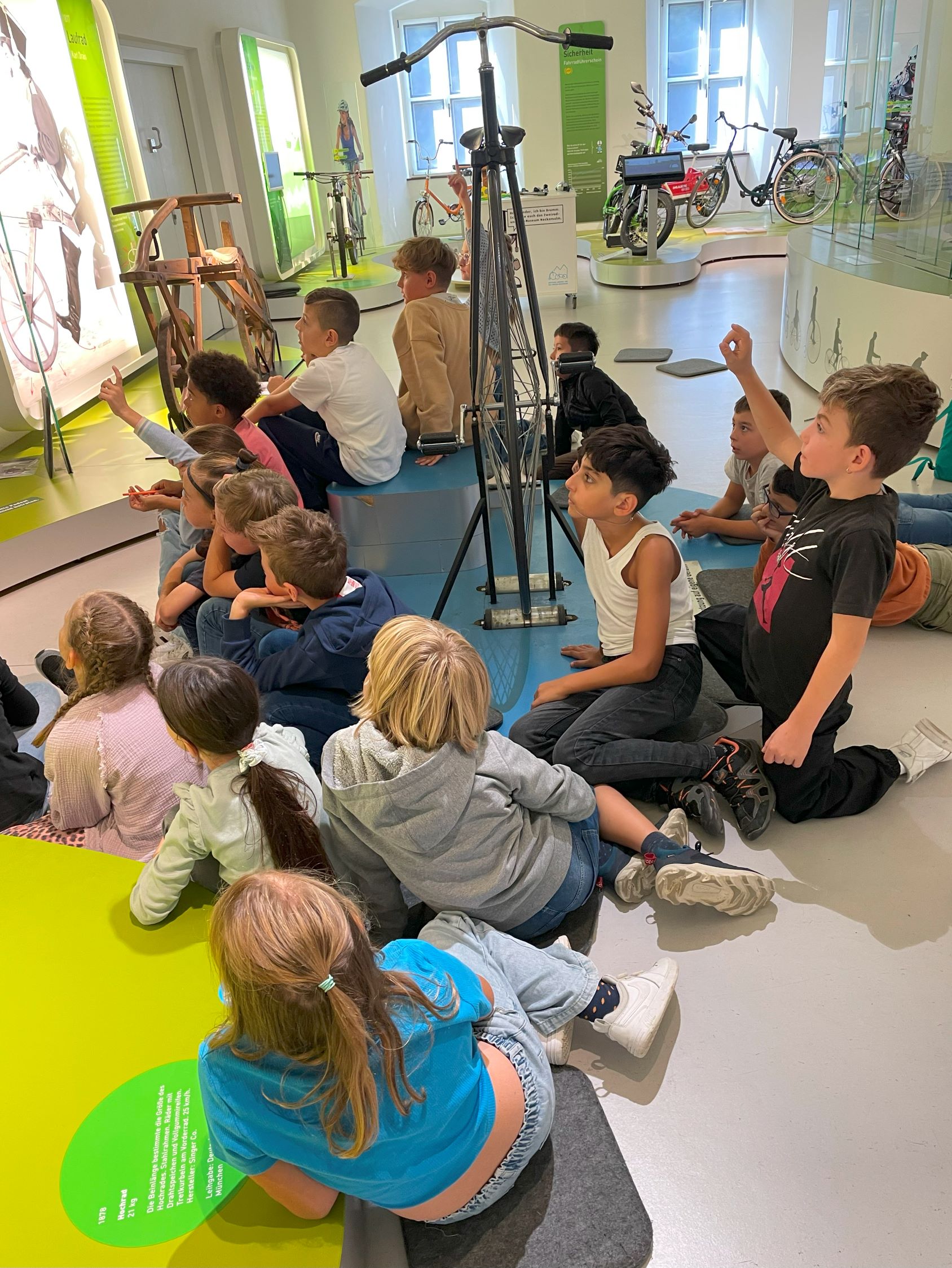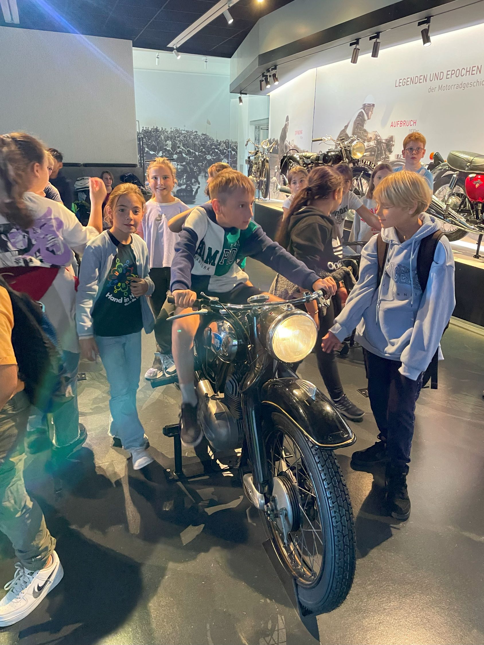 Voller Vorfreude auf die bevorstehende Radfahrausbildung machten sich die vierten Klassen am 27. September auf den Weg ins Zweiradmuseum nach Neckarsulm. Mit der S-Bahn fuhren die Kinder in Begleitung ihrer Lehrerinnen Frau Fuchs und Frau Link sowie Frau Veile ins Museum. Dort angekommen, wurden die Klassen aufgeteilt und alle Kinder durften das Museum in kleinen Gruppen kennenlernen. Anhand eines Rätselfragebogens erkundete erst eine Klasse das Museum und lernte einige Details von alten Zweirädern kennen. Voller Eifer und Freude beantworteten die Kinder die Fragen und durften am Schluss sogar selbst auf Motorräder sitzen, um das Fahrgefühl nachzuspüren. Zeitgleich erfuhr die andere Klasse Interessantes über die Geschichte und Entwicklung des Fahrrades und einige Kinder durften sogar die historischen Gefährte testen. Anschaulich wurde den Kindern anschließend die Notwendigkeit eines Fahrradhelmes und aller am Fahrrad vorgeschriebenen Gegenstände demonstriert. Beeindruckt von den neuen Eindrücken ging es zurück in die Schule.