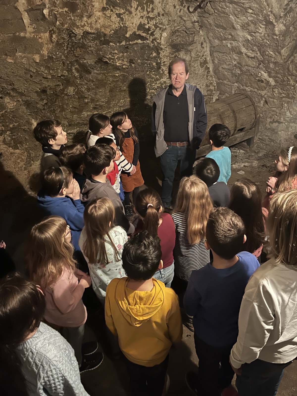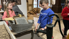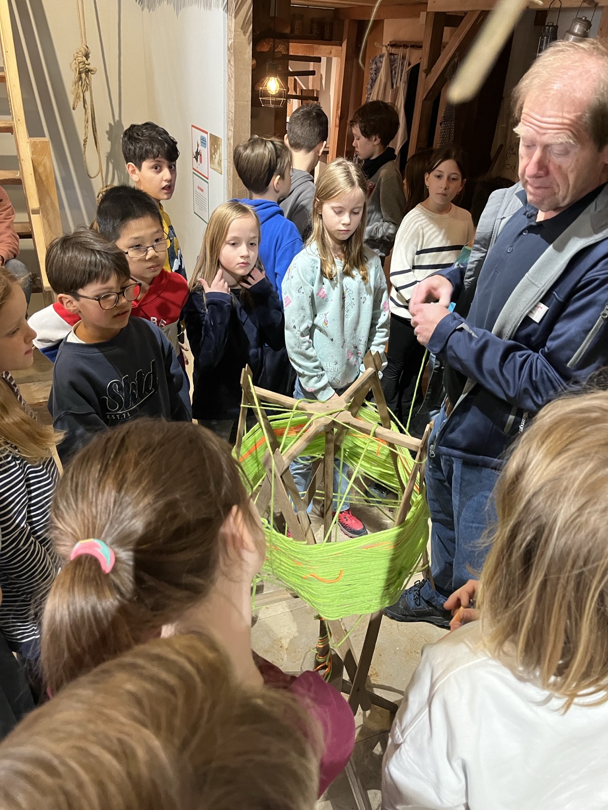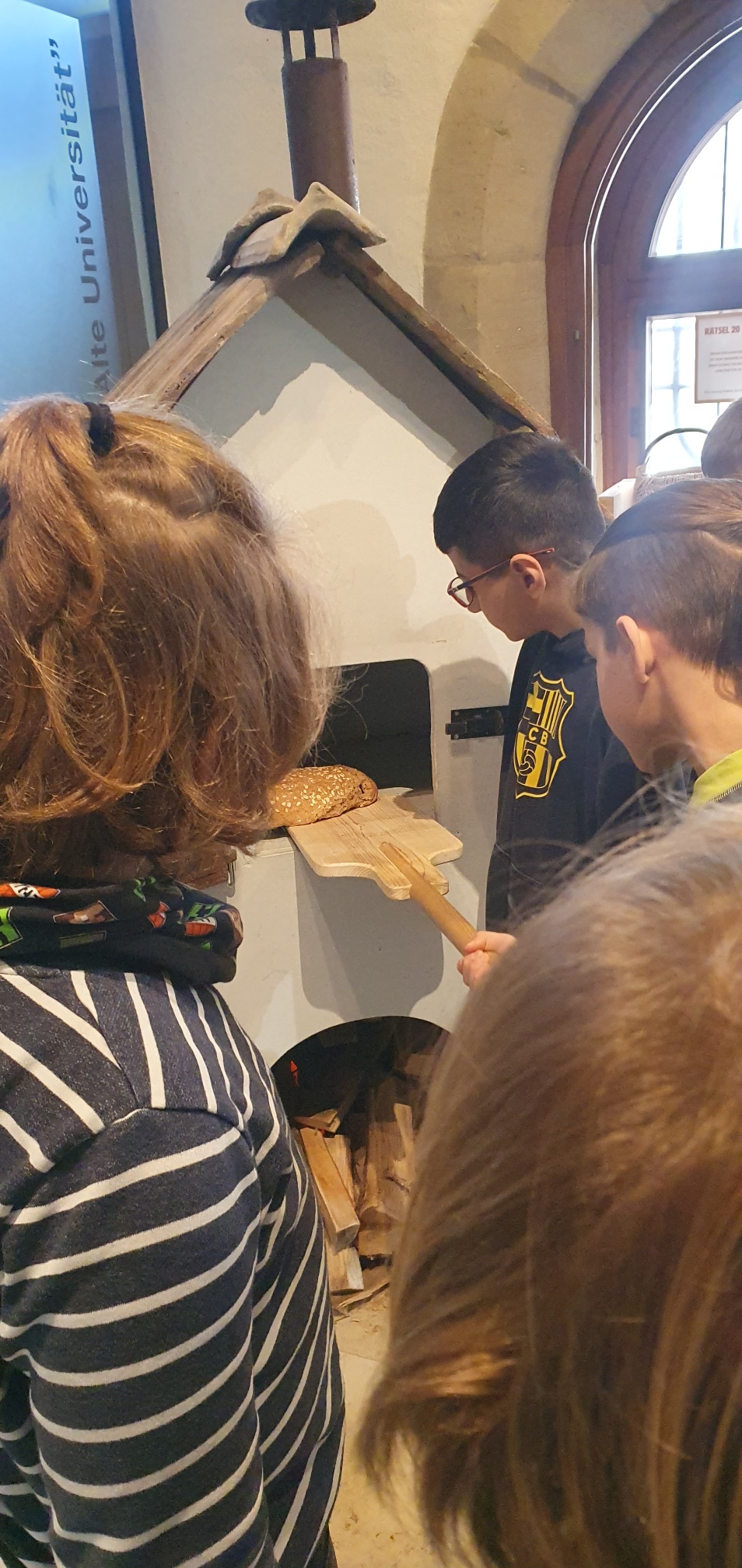 Die Frauen und Männer, die die einzelnen Klassen durch die Ausstellung führten, hatten viele Fragen zu beantworten. Manche Kinder brachten Vorwissen aus anderen Museen oder aus Erzählungen der Großeltern mit. So entwickelten sich rege Gespräche über das Schiff am Kohleherd, das Bügeleisen ohne Stecker und den Nachttopf in der Schlafkammer. Vier Kinder in einem Bett, das Vieh direkt daneben und kein fließendes Wasser. Für die Kinder war das schwer vorstellbar. In den Kellerräumen der Alten Universität gab es viele Spielsachen von früher anzuschauen. Zudem durfte auch an einer großen Tafel mit Holzklötzen und verschiedenen Brettspielen, die es auch schon früher gab, gespielt werden. Dabei hatten alle Kinder einen Riesenspaß und man war sich einig, dass das bei den Kindern früher auch so war.