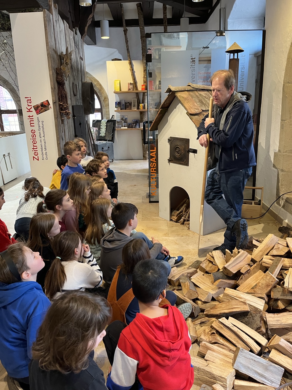 In den Wochen vor den Osterferien besuchten einige Klassen der Hans-Sauter-Schule die Mitmachausstellung „Zeitreise mit Krah“ in der Alten Universität in Eppingen. Mit der Bahn fuhren die Klassen an unterschiedlichen Tagen zur Ausstellung. Im Museum selbst war die Mitmachausstellung in die Vergangenheit liebevoll von den Mitarbeitenden des Museums zusammengestellt worden. Ein Kartoffelacker mit Erde, Kartoffeln mit Kartoffelkäfern wartete genauso auf die neugierigen Grundschüler/-innen, wie eine Küche, ein Schlafzimmer, ein Backhaus, ein Stall und ein Speicher mit Wäscheleine und Flaschenzug. Überall gab es viel zu entdecken.